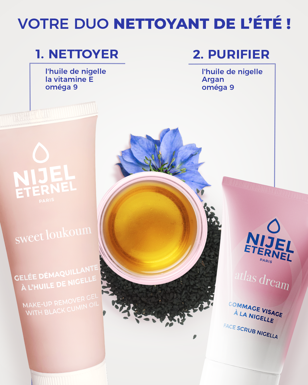 Découvrez notre pack duo incontournable pour une routine beauté naturelle et efficace ! Notre pack se compose d'un démaquillant à la nigelle et d'un gommage à la nigelle, deux produits essentiels pour une peau saine et éclatante.Notre démaquillant à la nigelle est spécialement formulé pour éliminer en douceur toutes les impuretés et le maquillage, même waterproof. Enrichi en huile de nigelle, il apaise la peau, réduit les rougeurs et laisse une sensation de confort incomparable.